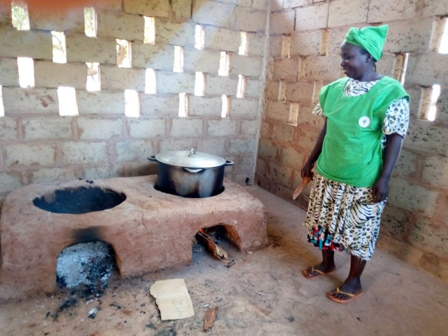 Die mittlerweile leider verstorbene Köchin Segunda Imbunde präsentiert stolz ihren neuen Ofen in der von ehemaligen Schülern und Stipendiaten neu gebauten Außenküche.