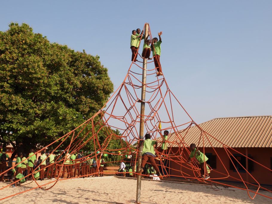 Seit wir den neuen Spielplatz eröffnet haben, herrscht auf der Kletterspinne Hochbetrieb. Spezialsand sorgt im Fall der Fälle für eine weiche Landung.
