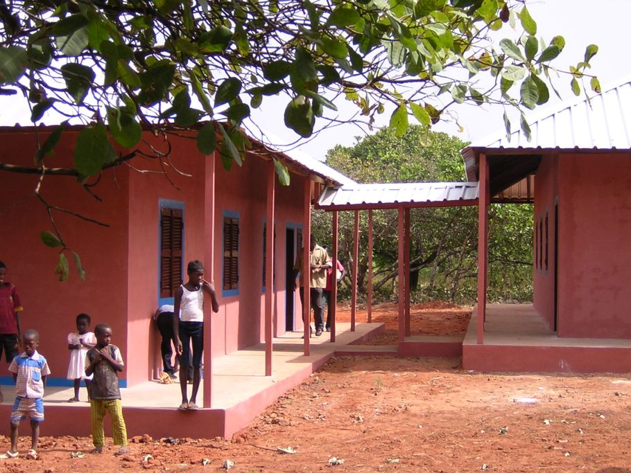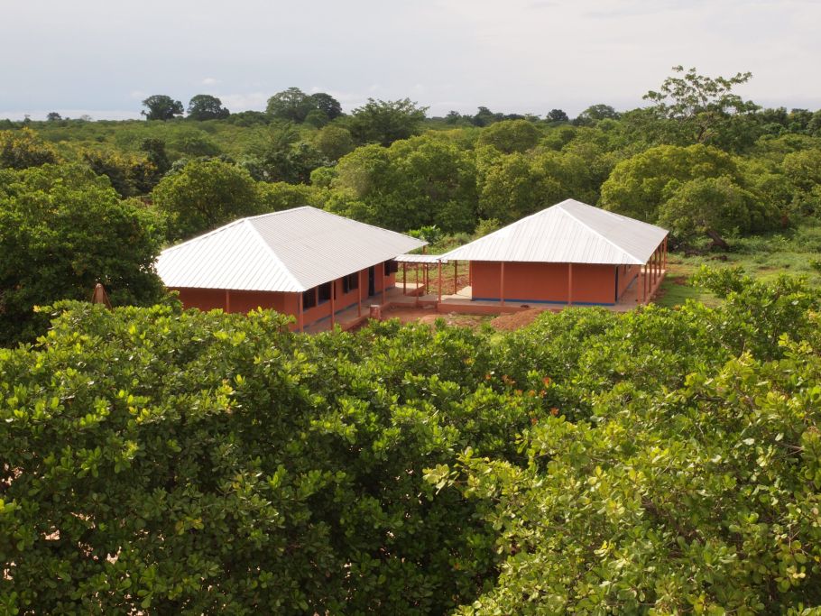 Ein überdachter Übergang verbindet die beiden Schulhäuser. Sie bestehen aus je einem großen Schulraum und kleinen Räumen fürs Sekretariat und die Toiletten. Der breite Dachüberstand schützt das Mauerwerk vor den extremen Regenfällen um die Jahresmitte.