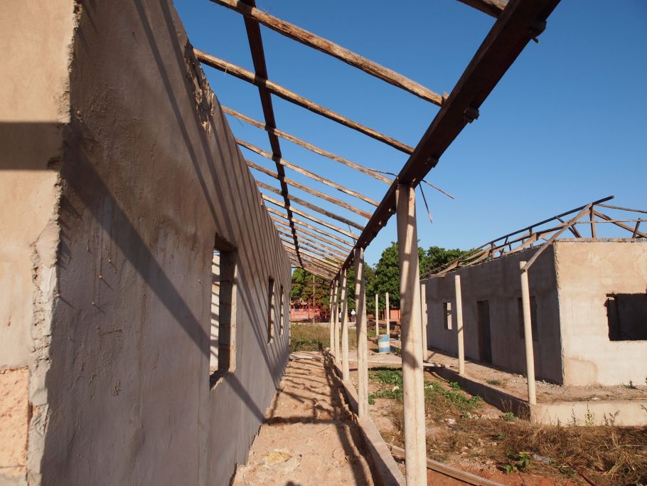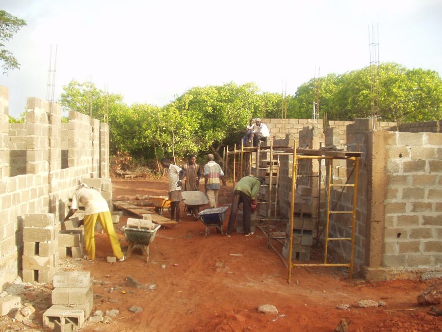 Noch vor Beginn der Regenzeit werden die Mauern hochgezogen. Die eingeschossige Bauweise erspart den Aufbau komplexer Gerüste. Wegen der allgegenwärtigen Termiten entscheiden wir uns für Beton und gegen Lehm.
