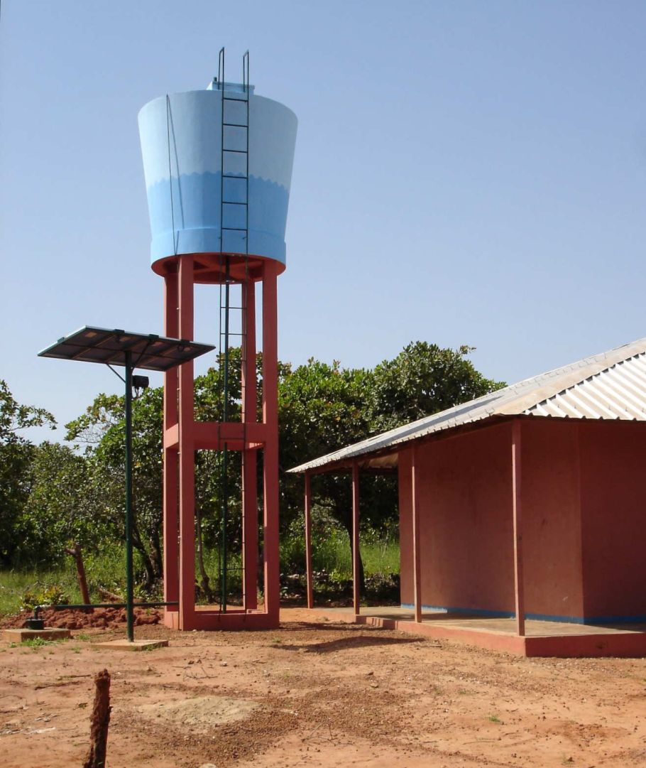 Nach der erfolgreichen Bohrung steht nun auch der Wasserturm. Eine kleine solarbetriebene Pumpe sorgt für verlässlichen Füllstand über das ganze Jahr hinweg. Die Investition in gute Qualität hat sich ausgezahlt. Noch zwanzig Jahre später sichern Pumpe und Turm die Trinkwasserversorgung der Schule.