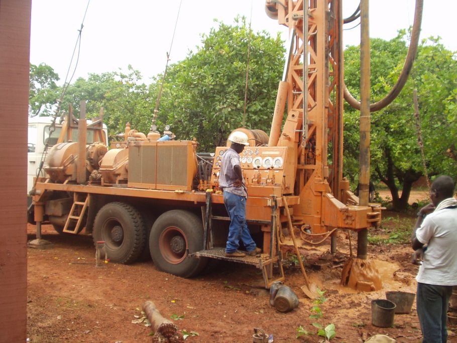 Endlich eigenes Wasser. Ein Spezialunternehmen bohrt in unserem Auftrag einen sechzig Meter tiefen Brunnen. Erst so weit unten ist das Wasser frei von allen Keimen.