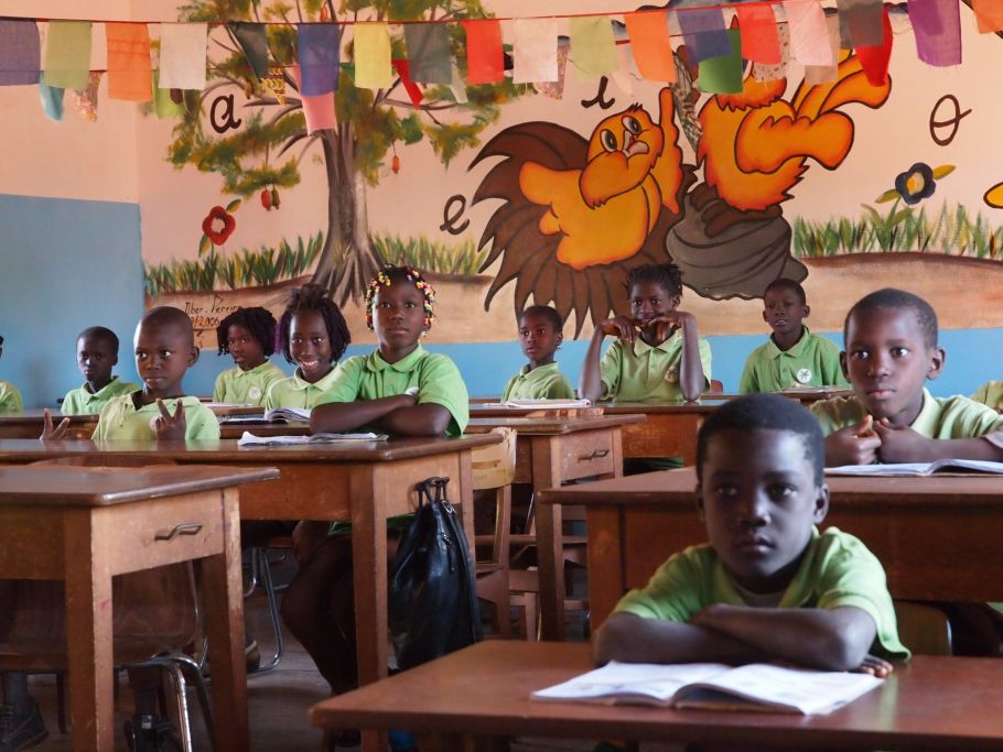 Gilt auch in Guinea-Bissau: Es lernt sich besser, wenn man sich wohl fühlt. Die Schülerinnen und Schüler haben viele Klassenräume mit Wandgemälden verschönert. Die Girlanden stammen vom letzten Schulfest und bleiben.